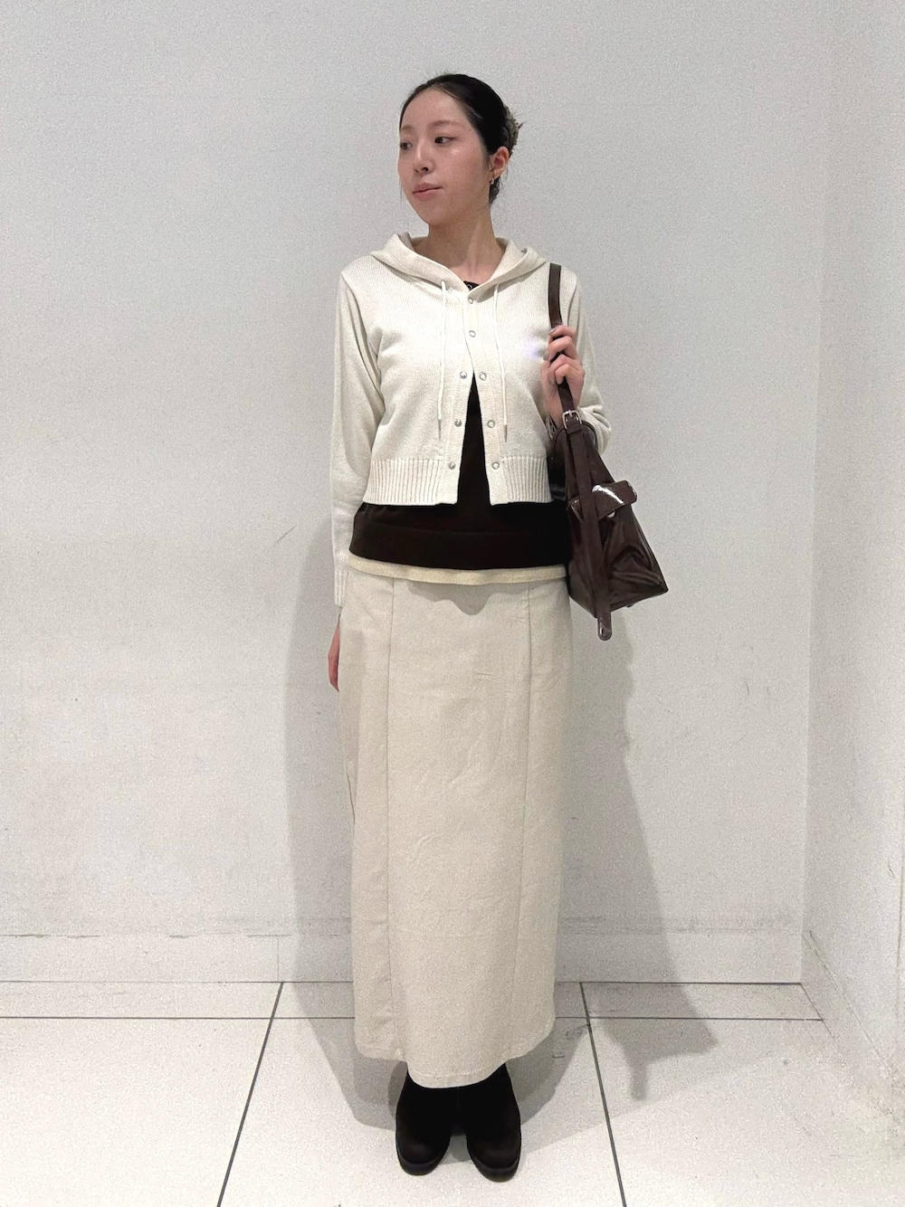 ご覧いただきありがとうございます! フーディーニットを使ったホワイトコーデです❕ ニットはピタッとしすぎてないのでボタンを上だけとめてレイヤードでインナーを合わせてもかわいいです👍 膨張しやすい白でも締め色を挟むことでメリハリが出ます(^-^♪