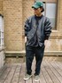 アウターのMA1のバックが古着のTシャツを切り貼りしたデザインになっていて特徴的なのでほかのアイテムは派手な物は入れないようにしました! ただ前から見たら黒ばっかになってしまうのでキャップとスニーカーにグリーンを入れて重たくなりすぎないようにしてます!