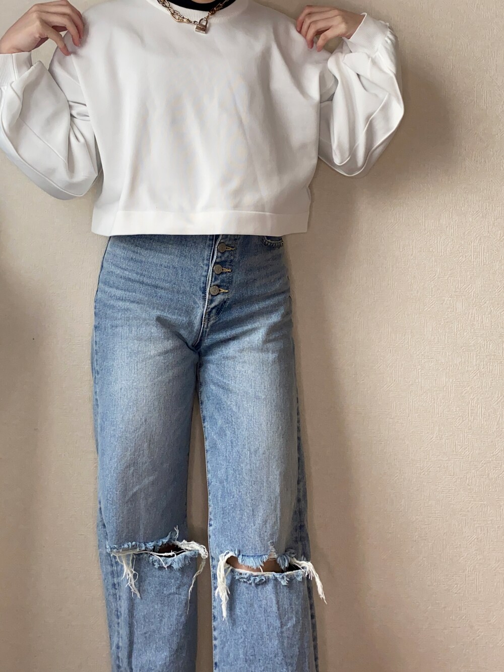 𝐘𝐔𝐍𝐀のデニムパンツ「ハイウエストダメージワイドパンツ」を使ったコーディネート