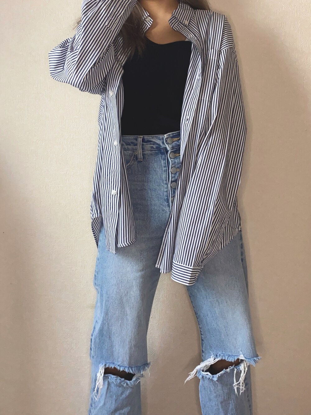 最近よく見るシャツのコーデ👔 ストライプ流行ってるなぁて思ってやっと購入😵💫💦 WEGOさんのバルーンスリーブになってるもので羽織って着るのが一番かわいい! メンズでも着れると思うのでオススメします🫶