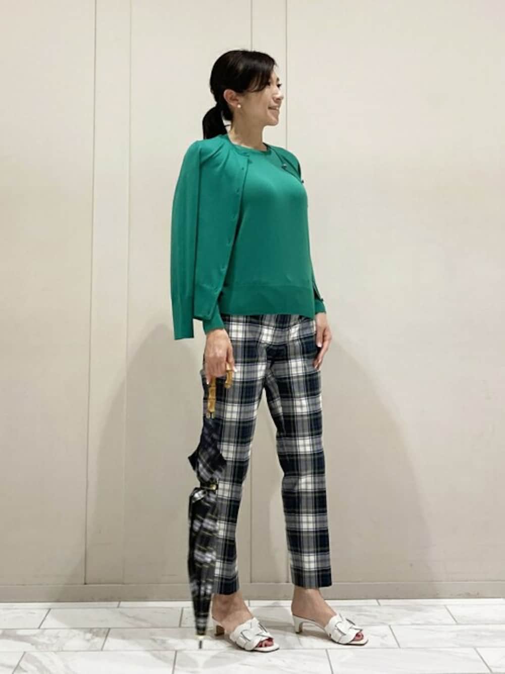 【The Essential Collection】ファインカウントニットアンサンブルにはチェックパンツをコーディネートしています。