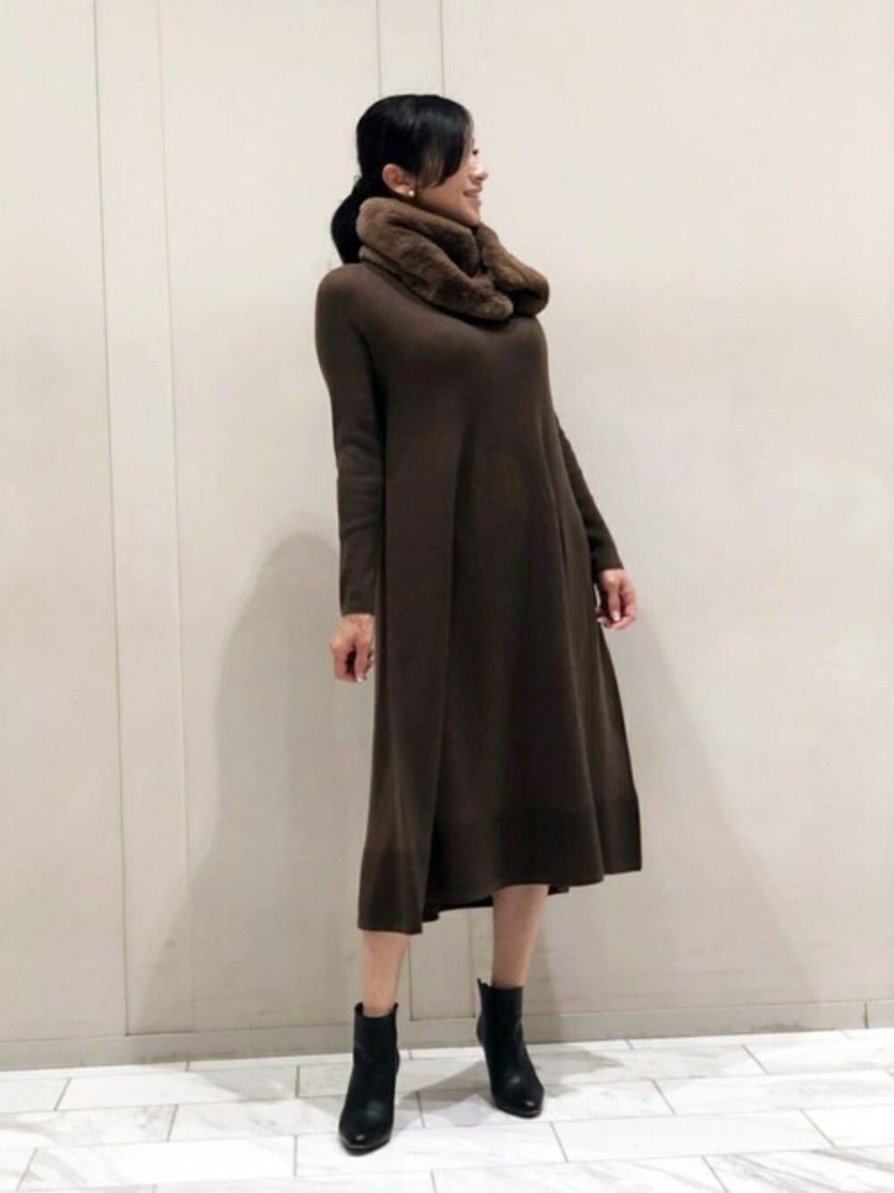 軽くて暖かなリブの切り替えがアクセントになったホールガーメントワンピースです。 歩くたびに揺れるフレアーがとても優雅です。 3WAYでお楽しみいただける肌触りの良いエコファーはスヌードやティペットのように様々なスタイリングができおすすめです。