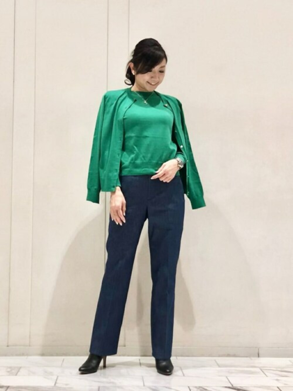 <The Essential Collection>のニットアンサンブルのコーディネートです。 選りすぐりの素材と拘りの縫製を駆使したアイテムは上品な光沢感としっとり滑らかな肌触りが特徴です。カーディガンは華やかなメタルボタンがアクセントになります。