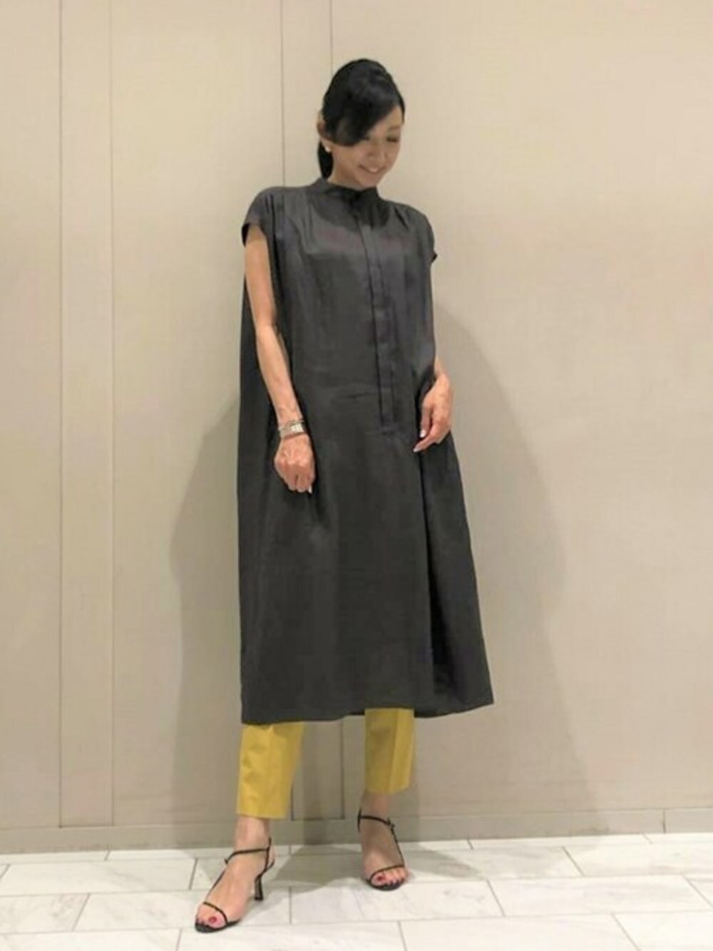ラミー素材の清涼感と程よい光沢感が上品なワンピースです。肩のギャザーから裾に向けて優雅に広がるシルエットが涼しげでこれからの季節に活躍します。イエローのパンツがアクセントのスタイリングです。