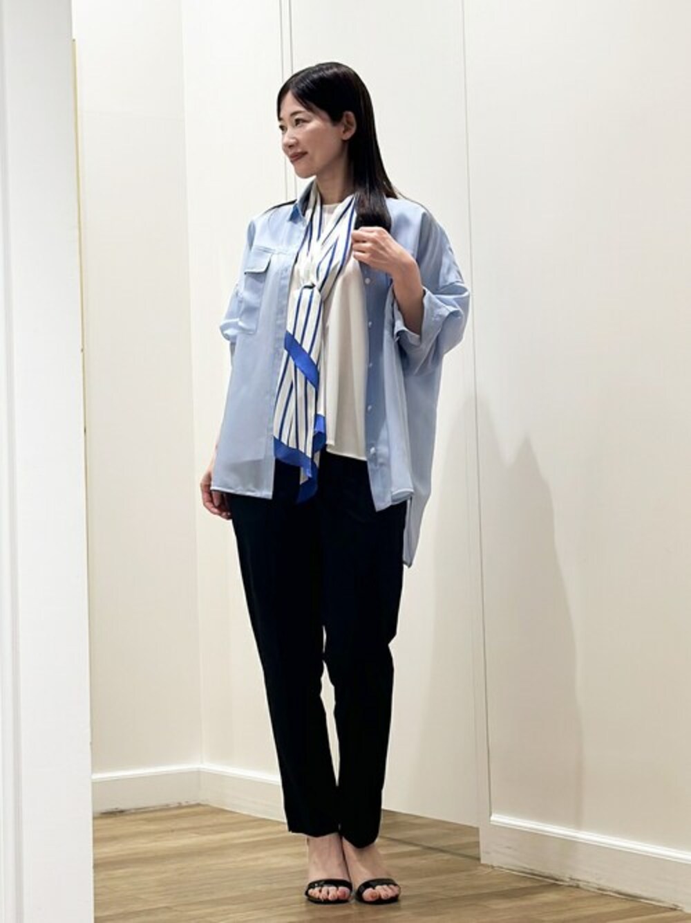 優しいブルーが今の季節にぴったりなシフォン素材のブラウスです。 深みのあるネイビーのパンツを合わせてブルーが引きたつコーディネートにしました。