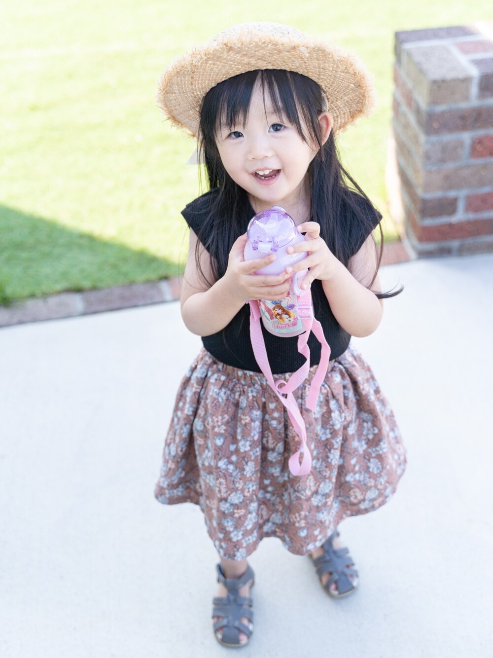 西松屋で白黒の2色買いした トップスの黒♡ スカートの肩紐はずり落ちちゃうから 中に入れて誤魔化した✧ お気に入りのプリンセスの水筒持って 家の前を走り回る娘、元気だなぁ💨💨