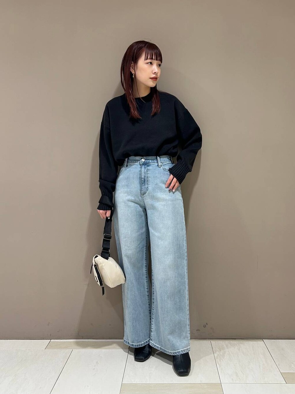 身長:163cm 体型:普通/骨格ナチュラル 普段着用サイズ:上下Mサイズ 着用サイズ トップス:フリー ボトムス:M 着用感 トップス: ややゆったりとしたサイズ感で体型カバーが出来て一枚でさらっと着やすいです。やや後ろにかけて長くなっています。生地感は厚すぎず薄すぎない程よい厚みで冬はもちろん、春先も一枚で着用していただけます◎ ボトムス: ややゆとりがあり、ウエストゴムで履き心地抜群 足回りもストレッチが効くので柔らかくて馴染みが良いデニムです。