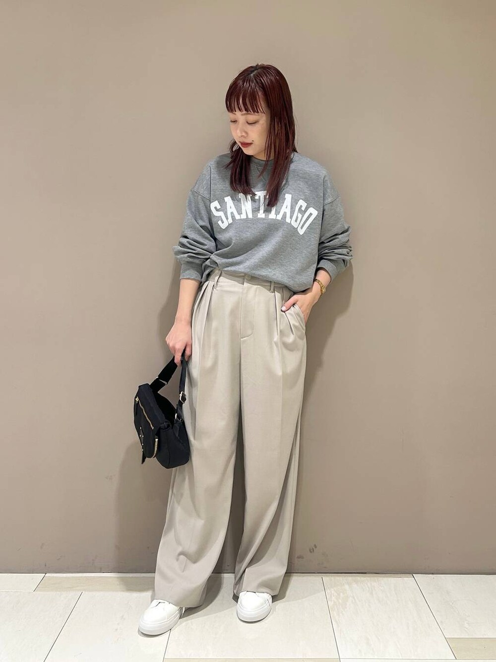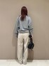 身長:163cm 体型:普通/骨格ナチュラル 普段着用サイズ:上下Mサイズ 着用サイズ トップス:フリー ボトムス:M 着用感 トップス:ゆったり、袖丈長め、裏地が軽く起毛している ボトムス:ややゆったり、丈感やや長め、ウエスト後ろ側がゴム仕様