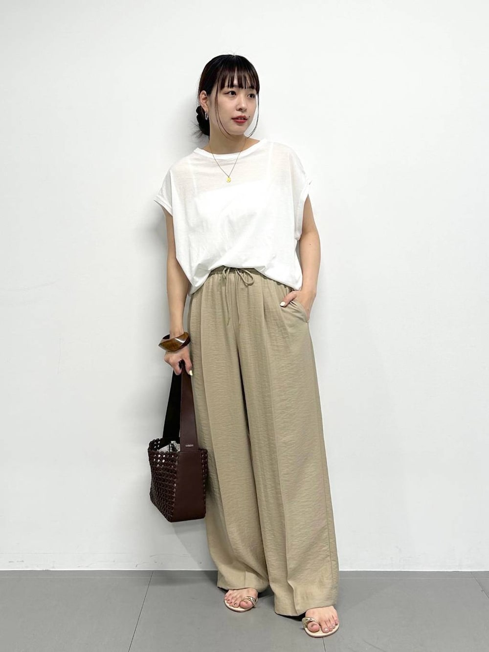 スタイリングを見返したい場合は、右下のお気に入りボタン(♡)を押すと保存できます! _ _ _ _ _ _ _ _ _ _ _ _ _ _ _ _ _ 身長:163cm / 骨格ナチュラル 普段着用サイズ:上下Mサイズ 着用サイズ トップス:フリー ボトムス:M 着用感 トップス:ゆったりめ、生地がとても柔らかく薄くて軽いので着心地抜群。 ボトムス:ややゆったりめ ウエストゴムで柔らかくてとても履きやすいです。薄手の生地で涼しく、程よいツヤ感とオチ感がキレイなパンツです。ジャケットと同素材。