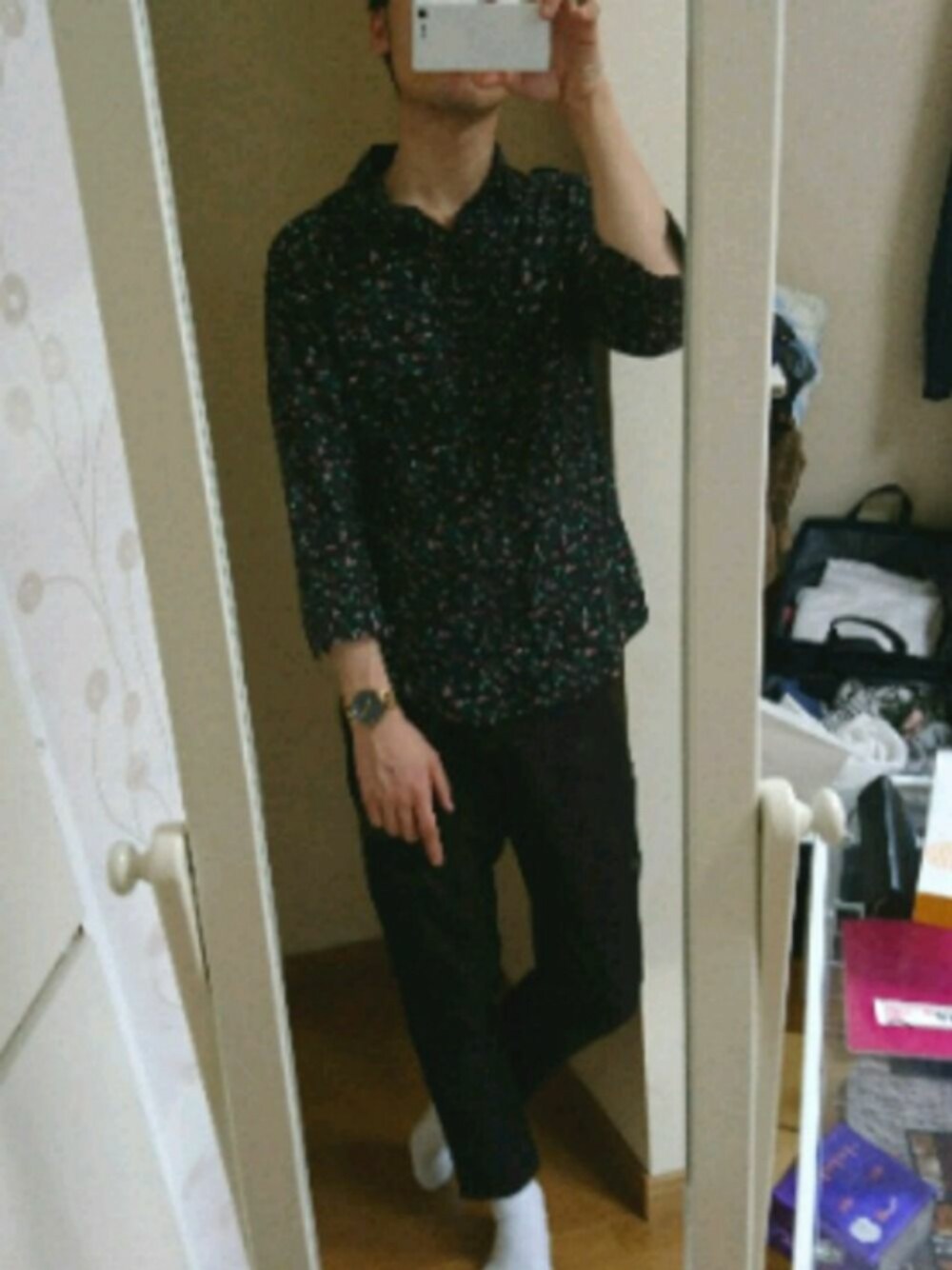 シャツ:Sサイズ パンツ:Sサイズ ブラックコーデ。 花柄かわいいですね、女性の花柄のパンツとか特に。 では、仕事してきます♪