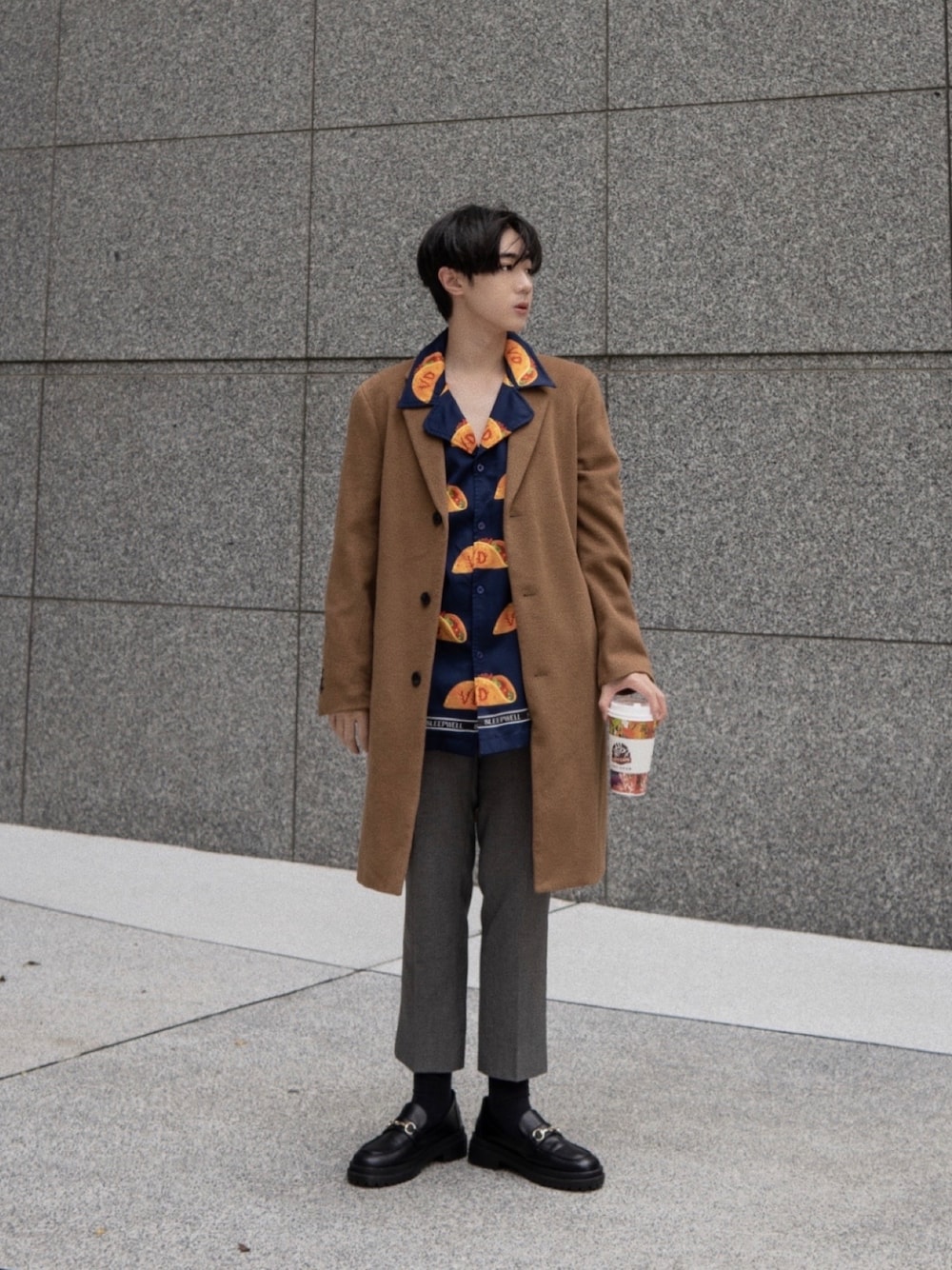 グレー系のスラックス、ブラウン系のピーコートを着用したメンズの秋コーディネートの1枚目の写真