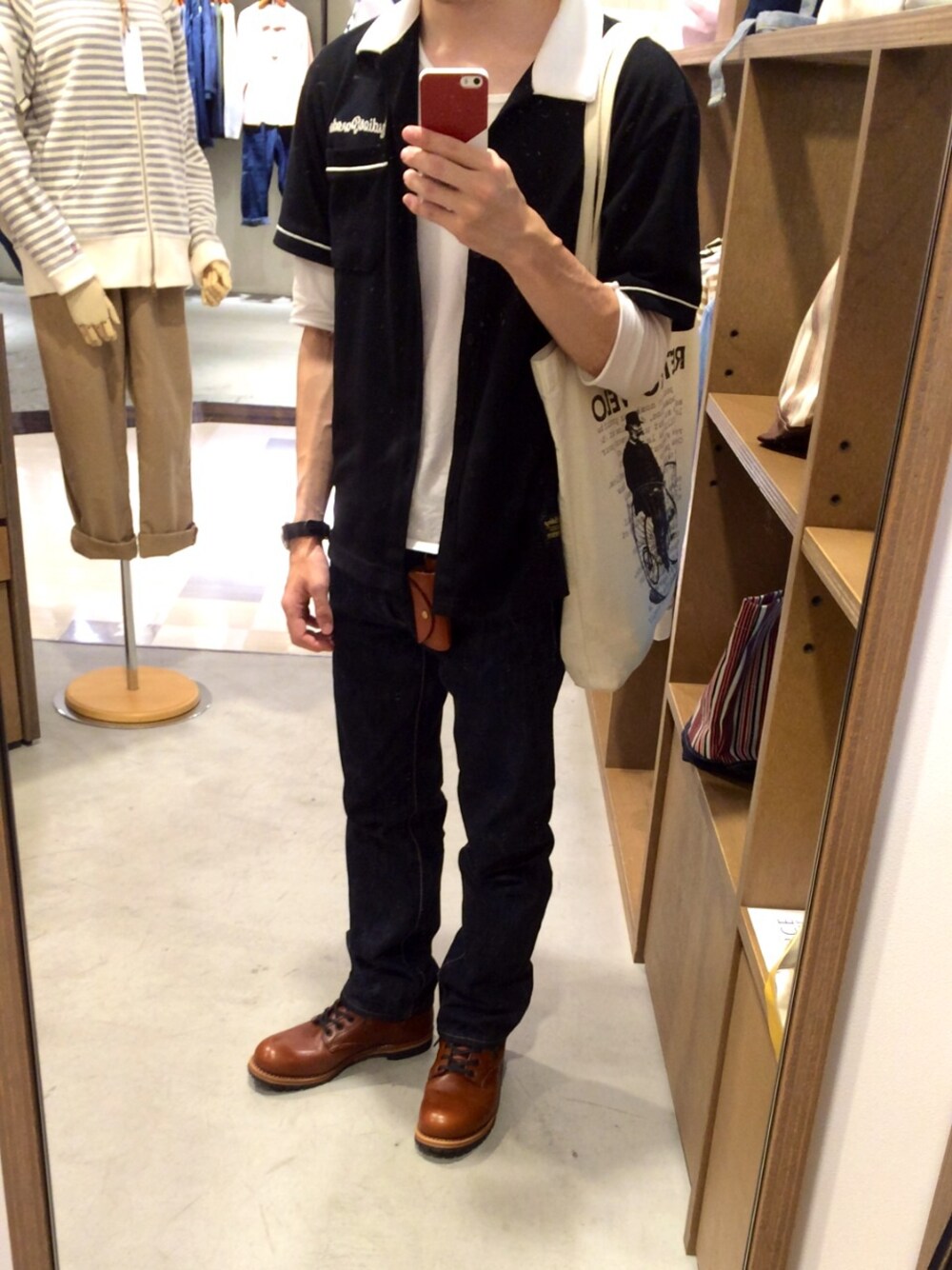 色が重たくならないように白のカットソーとトートをプラスしました 涼しくなってきたので久しぶりの桃太郎ジーンズ! そして買ったばかりのベックマン!かっこいいです!(ブーツが)