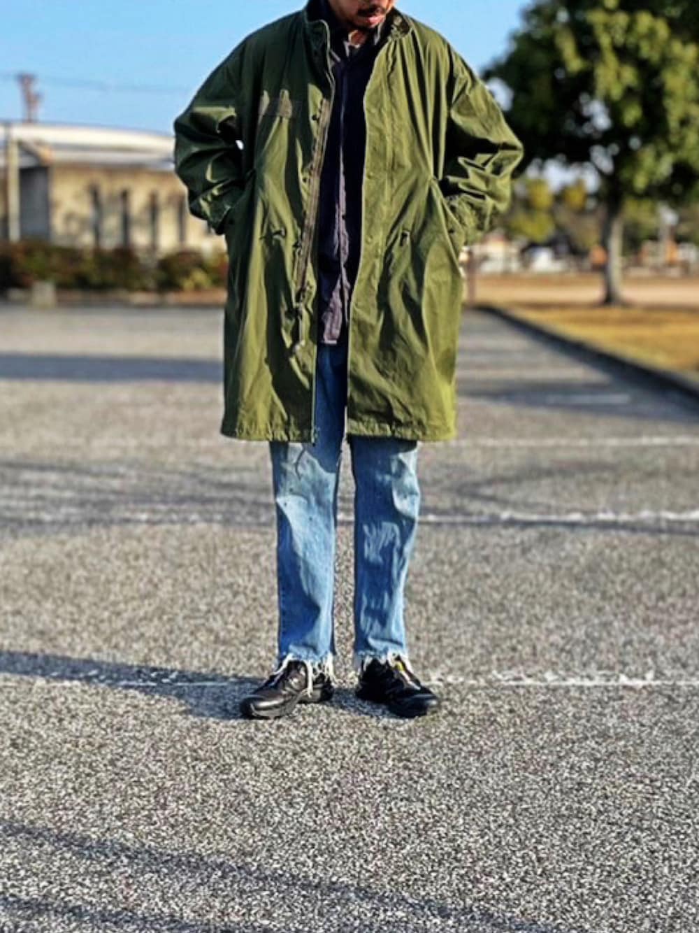 m65のモッズコートを主役に、デニムはクラッシュしすぎなカットオフ。春はできるだけ薄着でガバッと着たい。