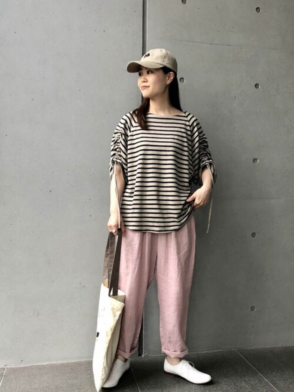 定番になりがちなボーダーは、デザインで差をつけて。 外しでピンクのリネンパンツとコーディネートすれば一味違ったコーディネートを楽しめます。