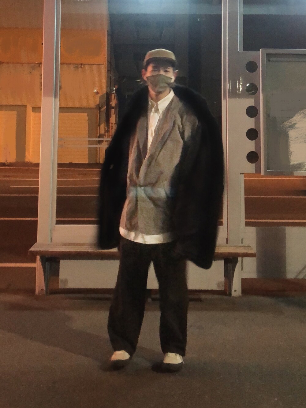 ファーコートでも寒いな。 デカシャツとキレイめジャケット もう一枚ベルト代わりに腰に巻いてるけど写りやんかった。いずれ。