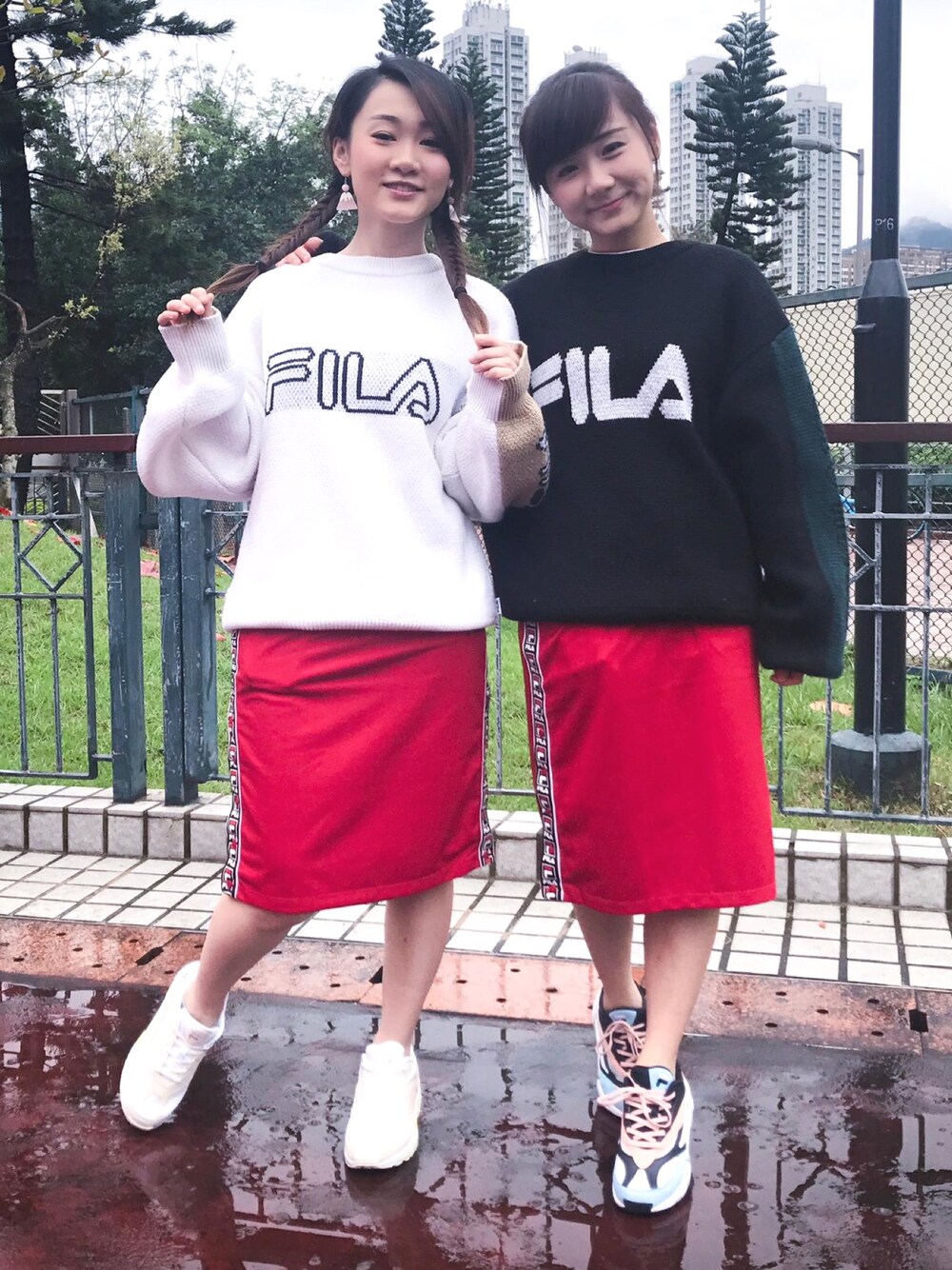 ブラック系のスウェット、レッド系のスカートを着用したレディースの春コーディネートの1枚目の写真