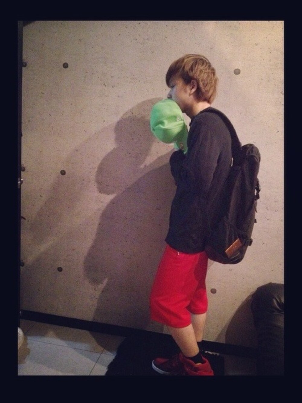 レッド系のスニーカーを着用したメンズの春コーディネートの1枚目の写真