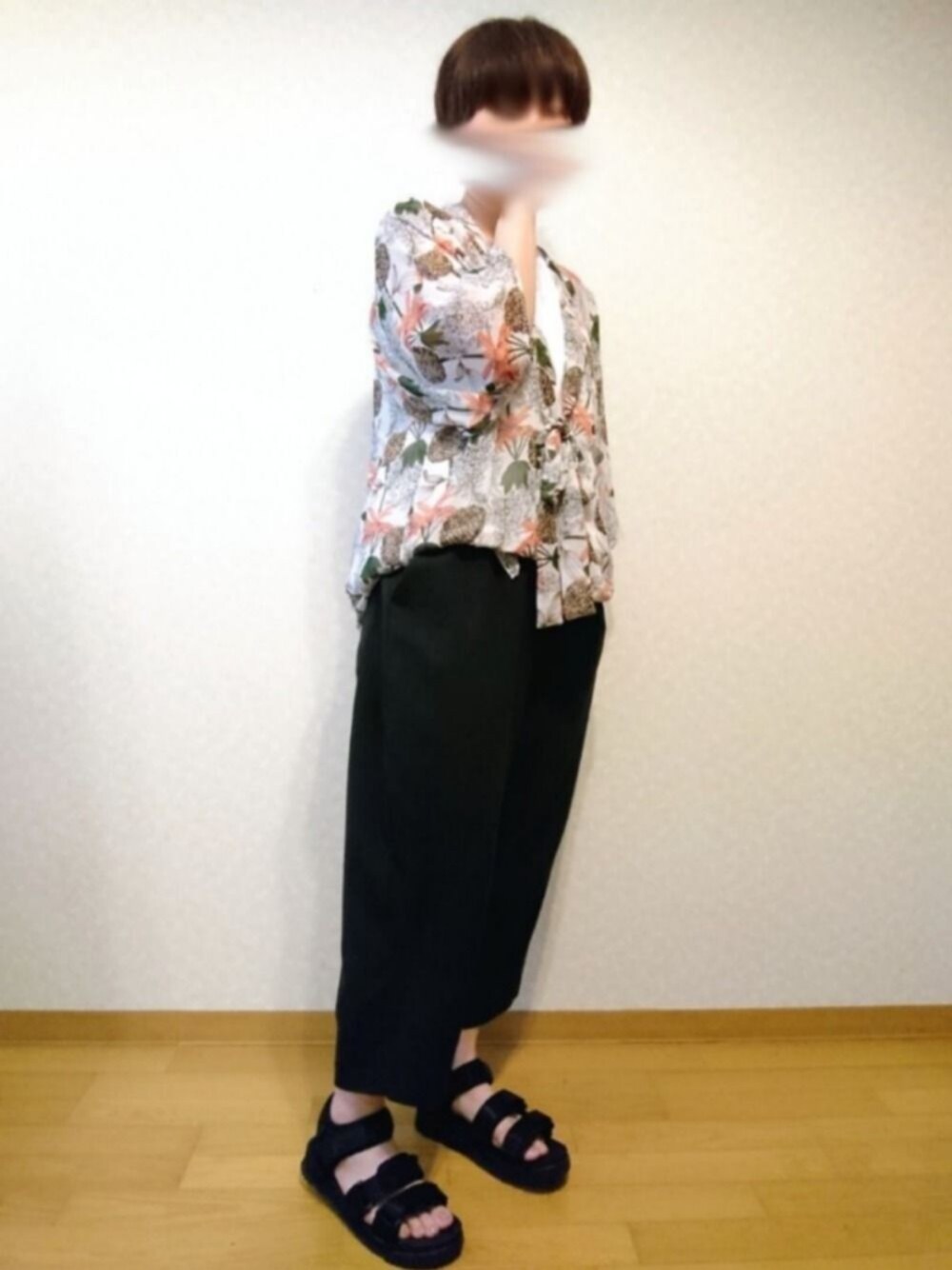 薄いカーディガンは タックイン できていいです。 柄シャツみたいで 好きかも✨ 花柄でもヘルシー(?)というか 主張が 強すぎないので 着やすい コレ🍏