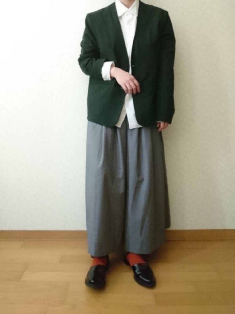 マカのノーカラージャケット「ストレッチ3ピースセットアップノーカラージャケット」を使ったコーディネート