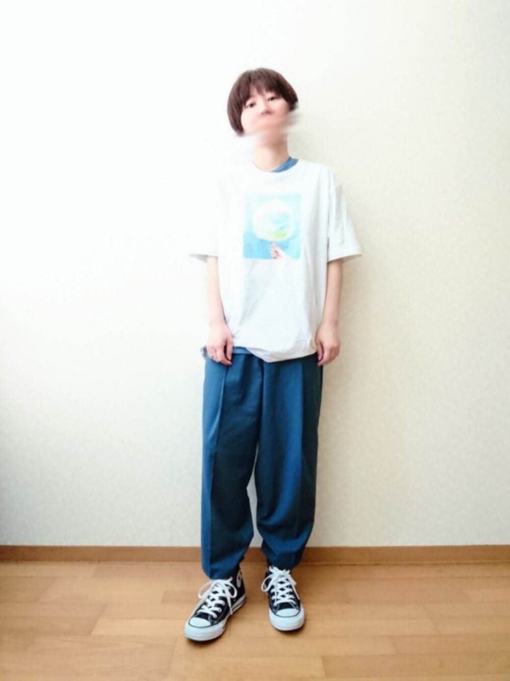 ひさびさの晴れで 夏みたい🍧 そんな 空と雲みたいな コーデに ☁️ このプリント Tシャツ 着たくなった。 買ったばっかだけど もう 何回か着てる。 1000円とは ビックリ しっかりした 生地だし かたちも 身幅感も 気に入りました ! すごいね WEGO ➰ 別色も かおかな ~△ Tシャツの インナーは HAREの モダールカットソー。 サラサラ✨ すきだ 😍 夏のインナー用に ブラウンとブルー 4枚買ったよ 。