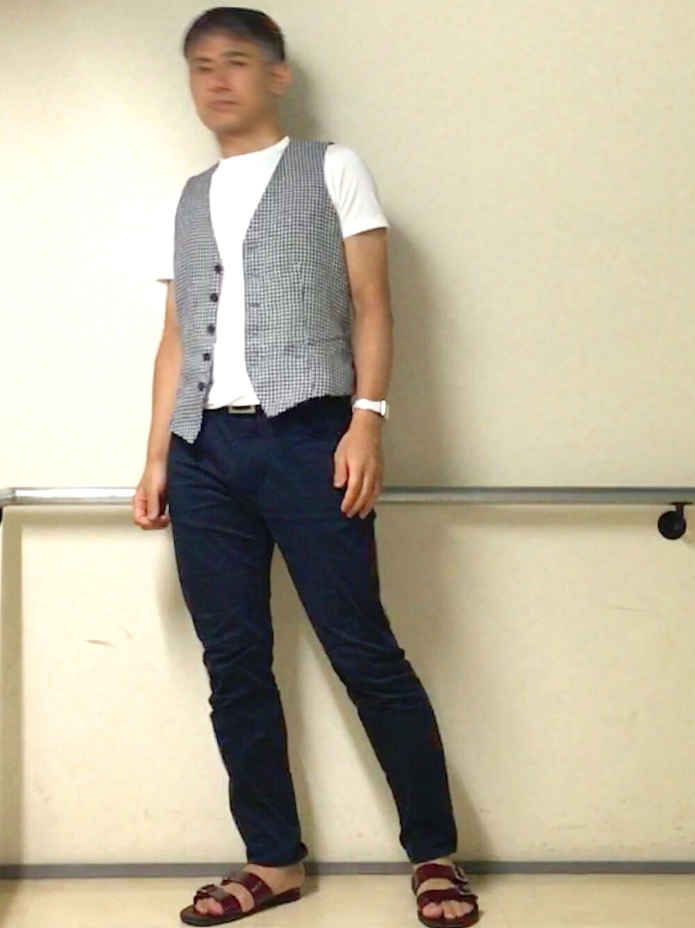 夏は、白Tにベストの格好は割と多いのですが、 この異常な暑さだと、綿100%のTシャツだと、汗がビッショリで肌にまとわりつくので、早乾性のあるTシャツを選びたくなります。 この白Tは、ボディの脇から背中にかけてメッシュになっているのですが、 丁度ベストで隠れてくれるので、そんなにカッコ悪くなりません。 通気性のある部分がベストで塞がれてしまうので、機能的に意味がなくなってしまうとも言えますが…(汗)