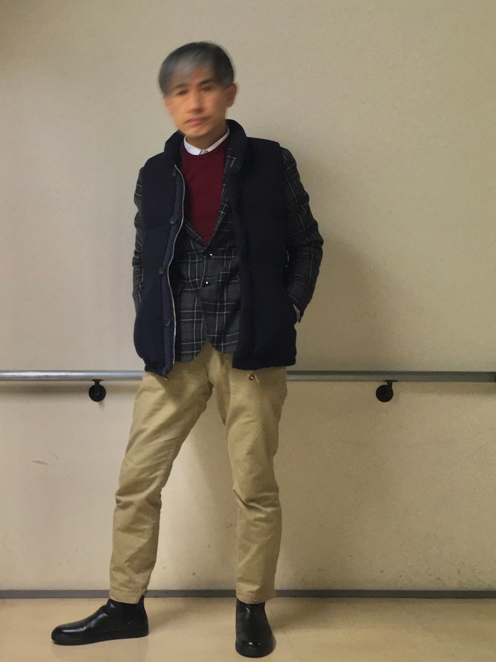 ジャケットの丈の短さと ダウンベストの丈の長さ(というよりサイズの大きさ)とのバランスが悪くて、ちょっと気にはなりましたが、まあ…いいかと。