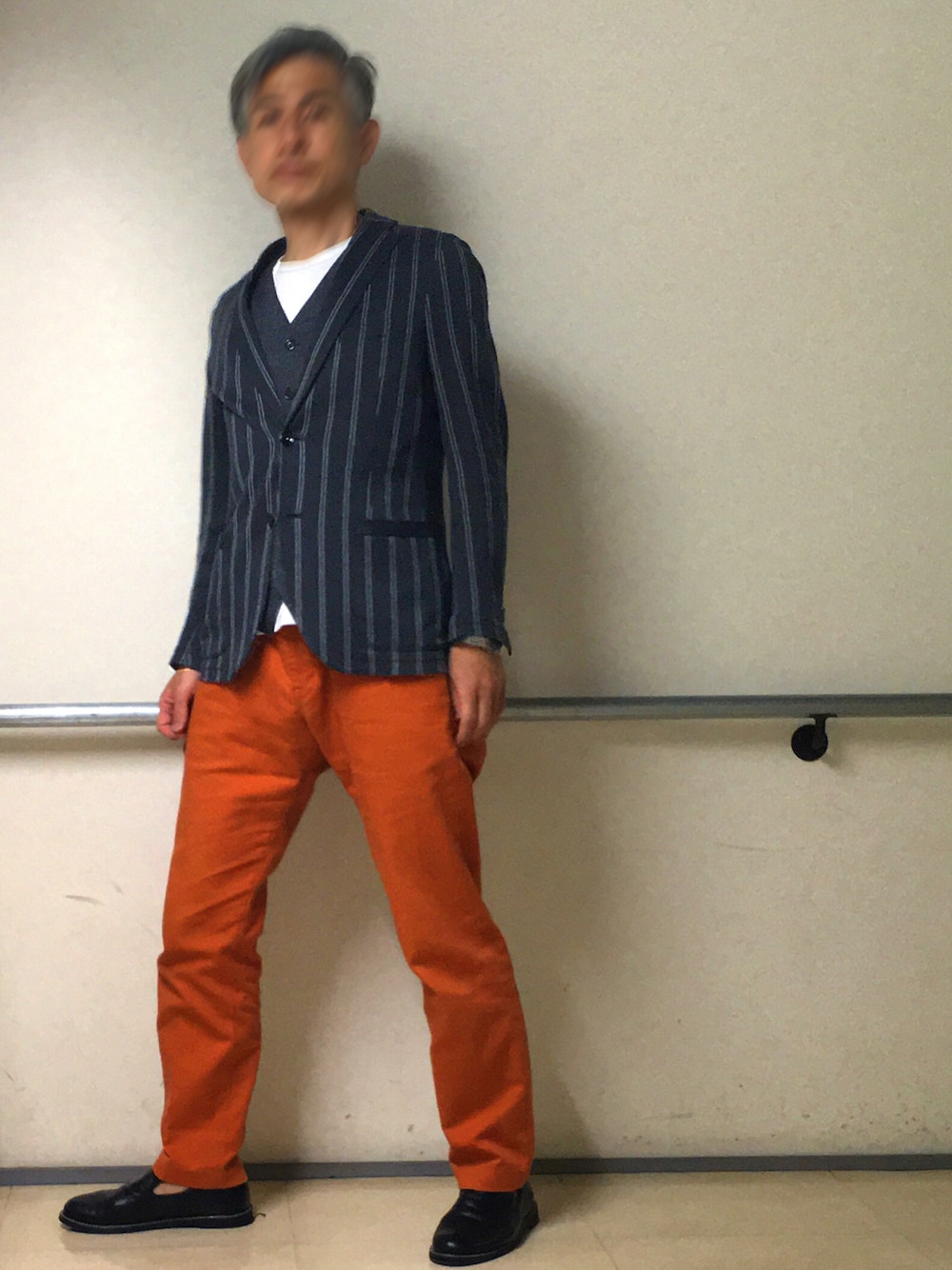 6月になってもここ数日は気温がそれ程高くないので、汗っかきな自分でもジャケットがまだ羽織れます。 おっさんにもなると暗い色ばかりの服を選んでしまいがちで、特にパンツはその方が無難なのですが、明るい色も穿いてみようとオレンジ色を数年前に購入したものの、やっぱり合わせ難く穿く機会が減り、久し振りに穿いてみました。 太腿に合わせたためウェストは元々余裕があったのですが、16時間断食を始めて10キロ痩せてから、以前載せたコーデの頃よりフィット感がユルめになってしまいました。