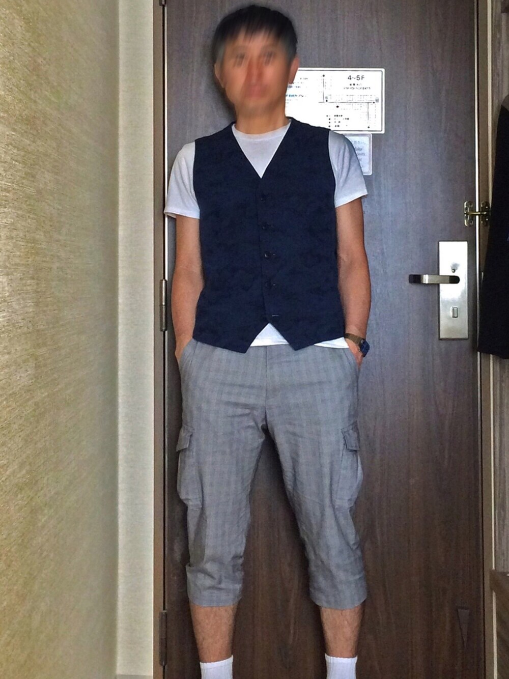 前日に着ていた白シャツとカーディガンとキャップを脱いだ状態です。