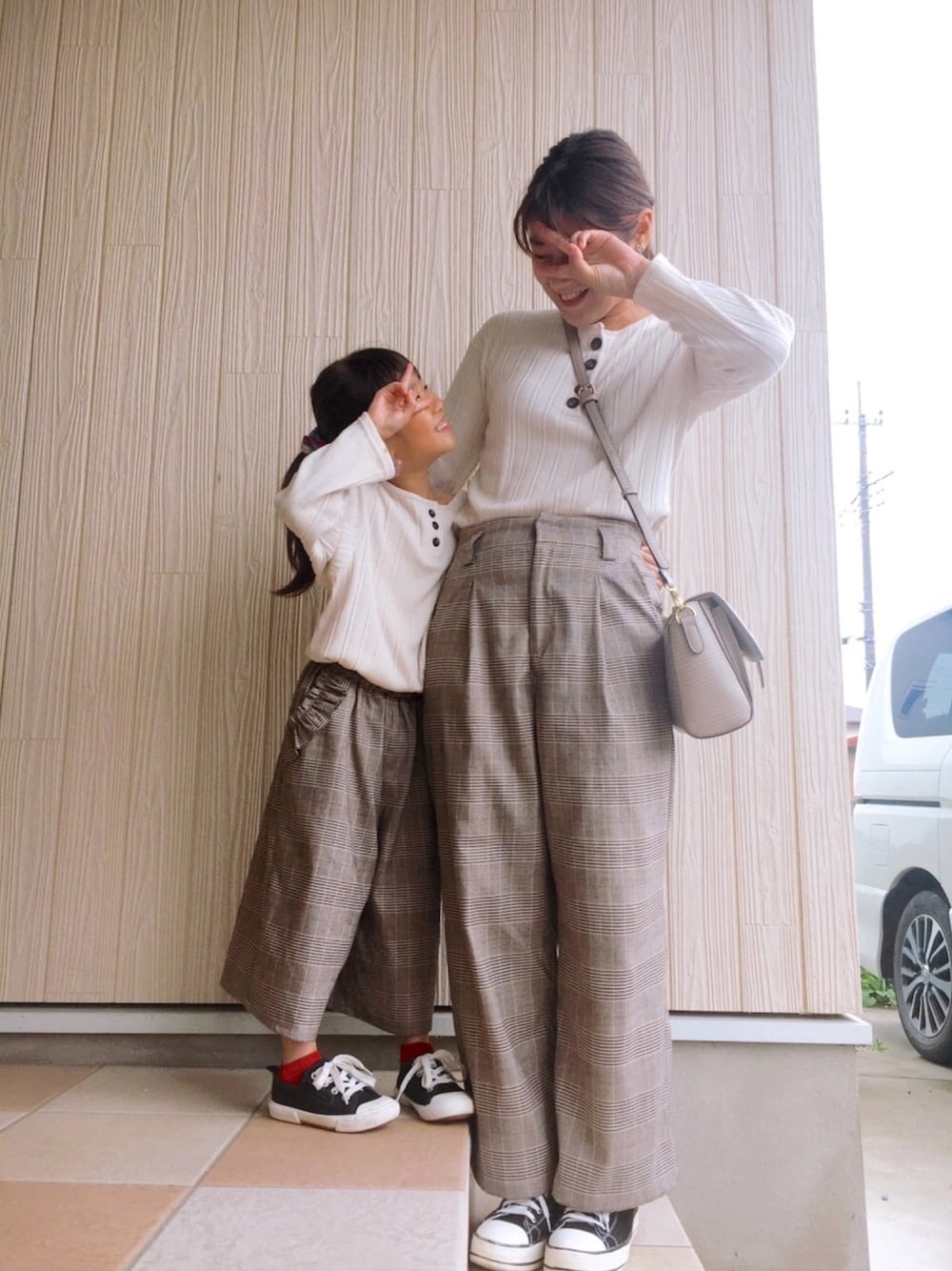 昨日のコーデは家族でお出かけということで、 またグレンチェックパンツ合わせしました⸝⸝⸝ 娘とは、念願のプチプラのあやさんの ヘンリーチュニックを使ってオソロに˗ˏˋ ♡ ˎˊ˗ やっぱりこれ、秋コーデにぴったんこすぎる!