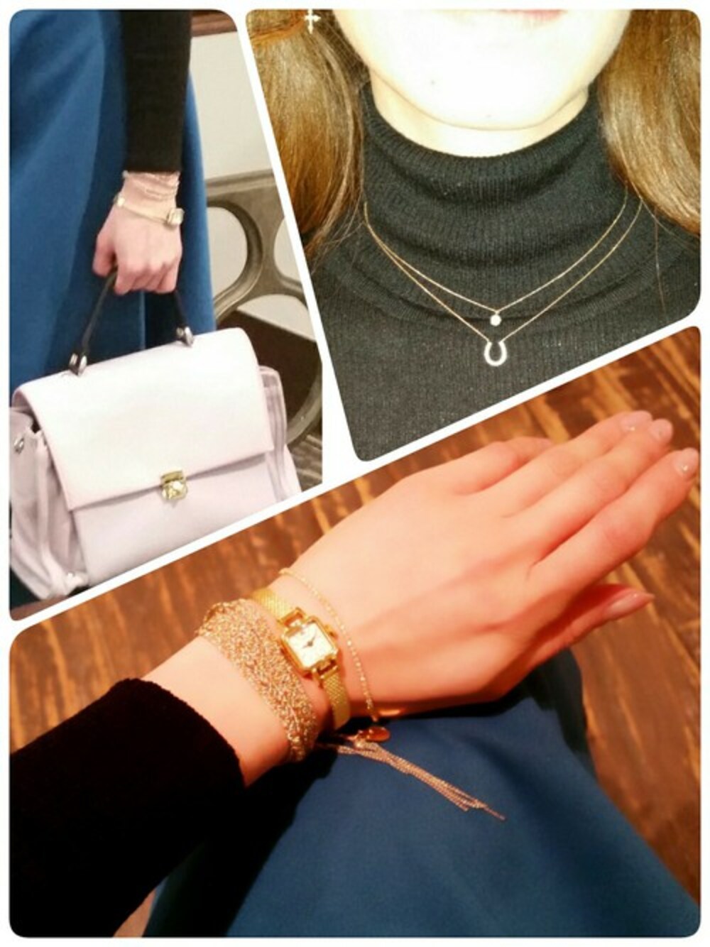 ダイヤモンドブレスのラグジュアリーアイテムとソゴリのカジュアルブレスのコーディネート。 ゴールド色のチェーンが編み込まれたソゴリのアイテムは、巻くだけで手もとを簡単に華やかにボリュームアップできます。ダイヤモンドブレスとあわせることでより大人のコーディネートに。