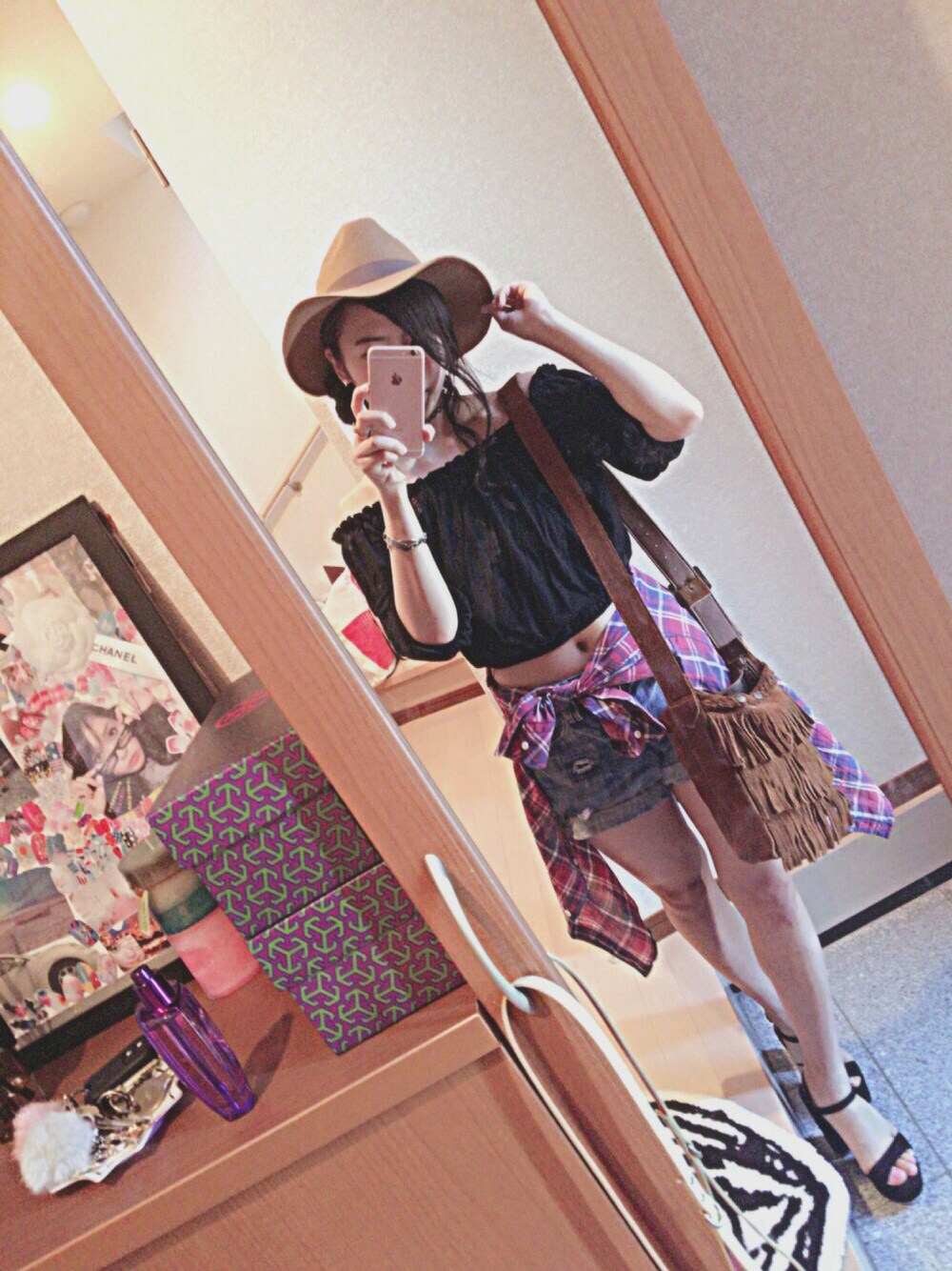 お団子してハットをかぶって夏っぽく❤︎ オフショルで空いた首回りにハートのチョーカーつけてます 。 フリンジのバックがポイント💫