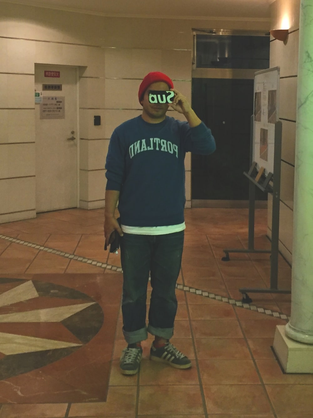 冬。スウェット。赤ニット。