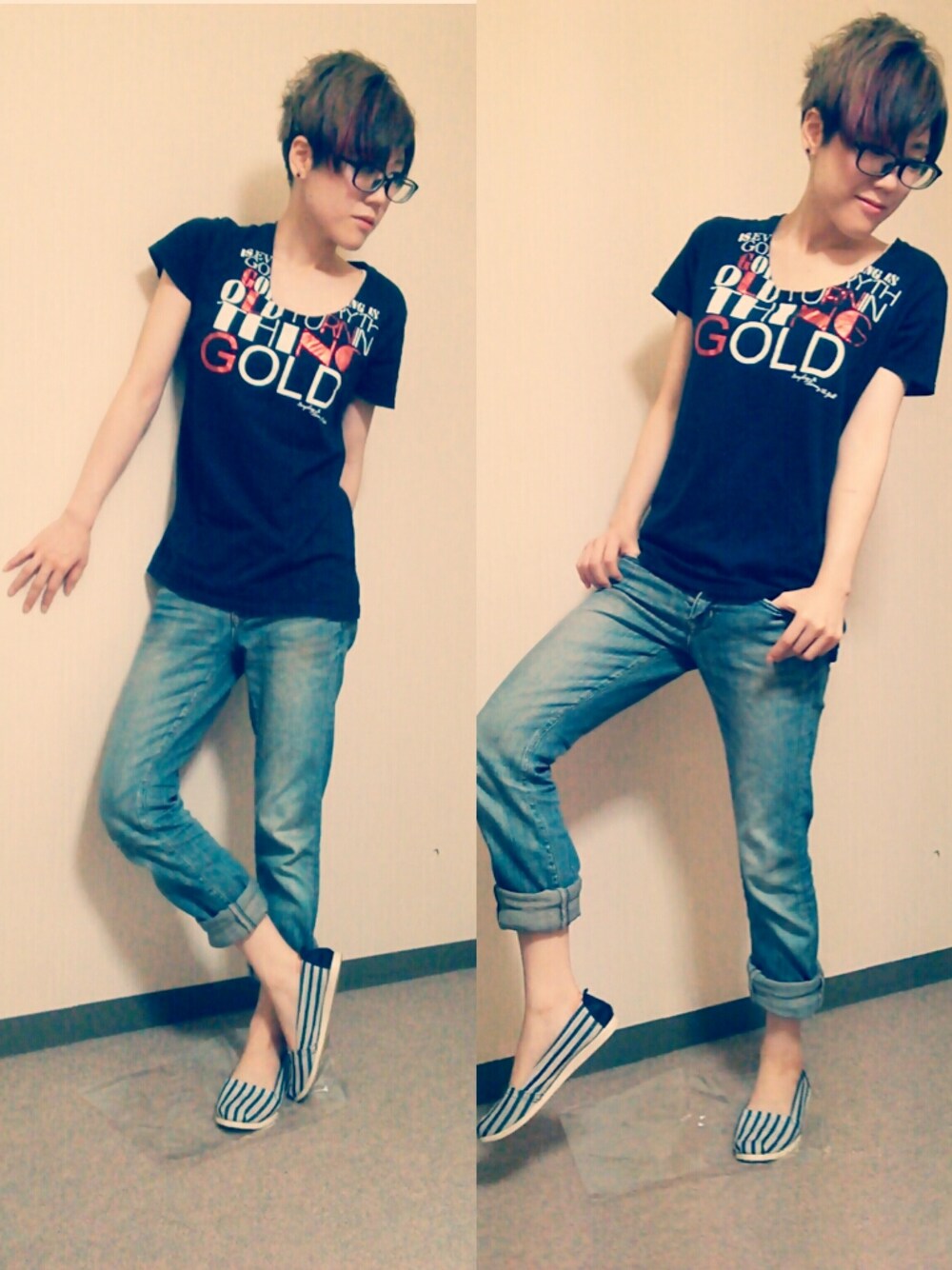 髪の色がちょい赤なんで、トップスのロゴカラーに合わせて、ブルーとレッドで固めてみましたん。 夏ステキ。 tops:メンズTAKEO KIKUCHI pants:Right-on shose:ABCマート accessory:度入りのめがーね