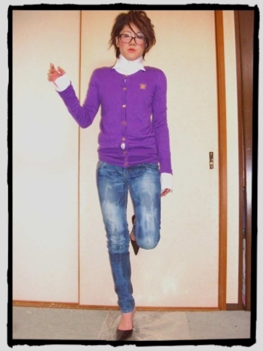知的な感じでwww 知的な感じで撮ろうと思ったら。。。 やべ。腹の一部からシャツが出ている(笑) でも、このパープルのぴちぴちカーデがお気に入りなのです(笑)
