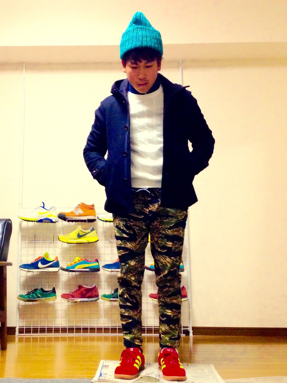 knit/UNIQLO ニット帽/雑貨屋 白ニットも、迷彩パンツとニット帽でやんちゃに(^^)