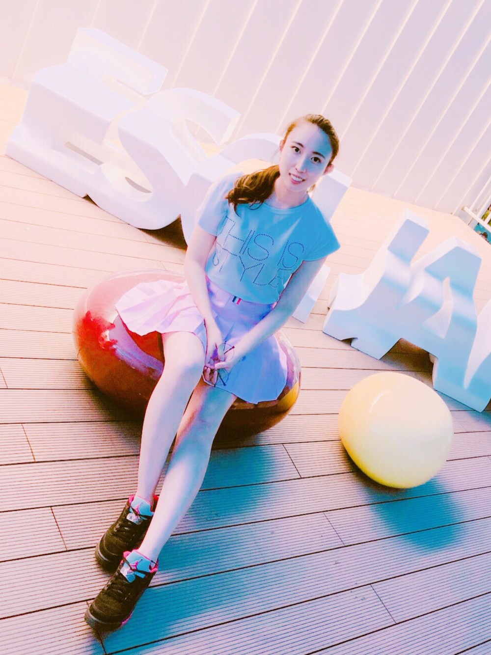 White shirt Pink pleated skirt Sneakers