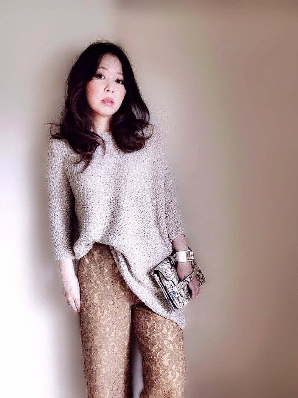 はい、今日も冷える北国です~ ゆったりたっぷりとしたサマーニットに、レースガウチョを♡ ベージュとブラウンで同系色コーデ♪