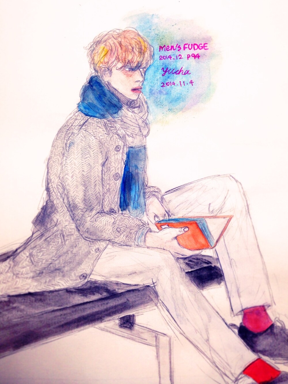 シンプルな服装に真っ赤な靴下が素敵なメンズファッジのモデルさんです。
