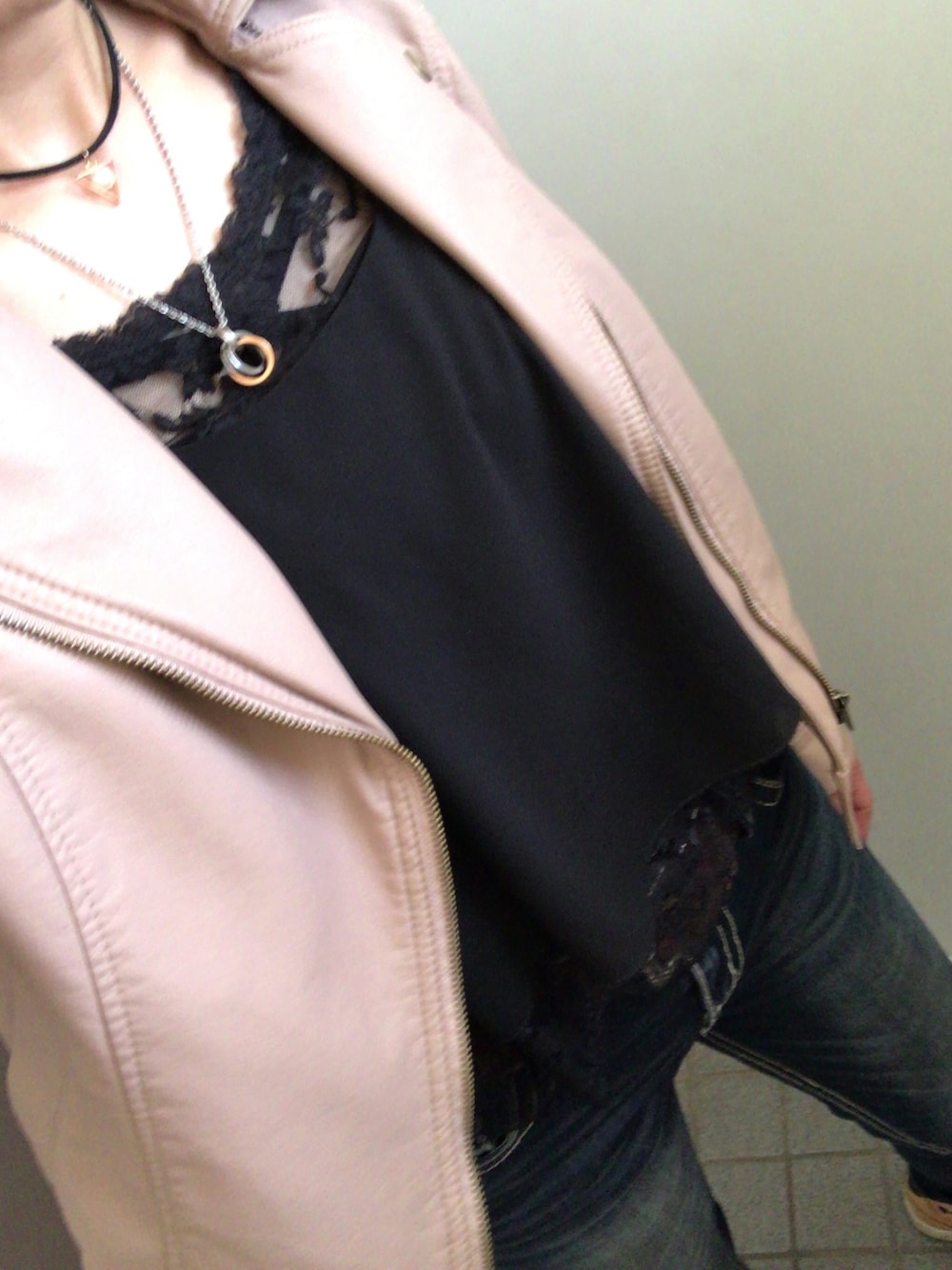 着用ライダースは去年のものなので 今年は少し違う形で 販売されてるみたいです。 靴はティンバーです。 普段は黒パンプスを合わせてます。