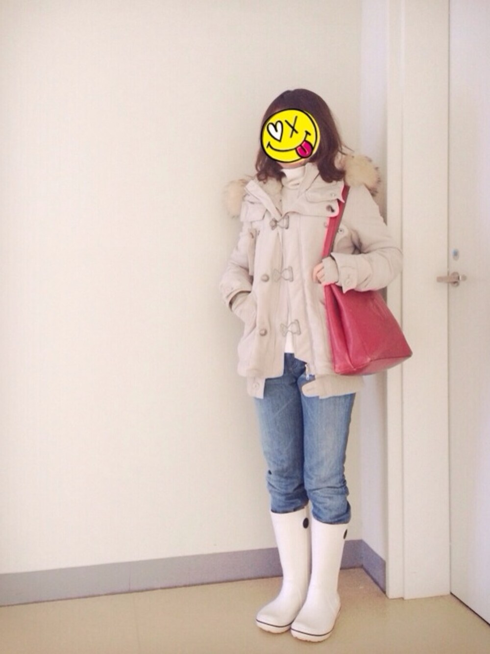 今日はいつもの通勤コーデ。 こんなラフな格好で通勤してます♪ 外は雪なので、レインブーツにしました。 このブーツ、見た目もかわいいし、雨雪の時に使えるし、お気に入りです(*´・v・`)