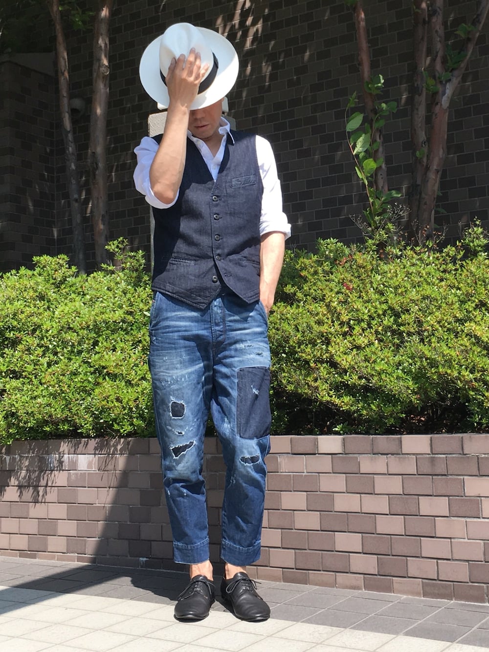 毎日、暑いですねー☀️ 今日のテーマは夏のイタリアおやじ笑 上半身は白シャツにデニム地のジレ、パナマハットと綺麗目なのでボトムスに大胆なリペアパッチ、ルーズなシルエットのクロップドデニムで思いっきりカジュアルダウン 足元はあくまでもレザーシューズで