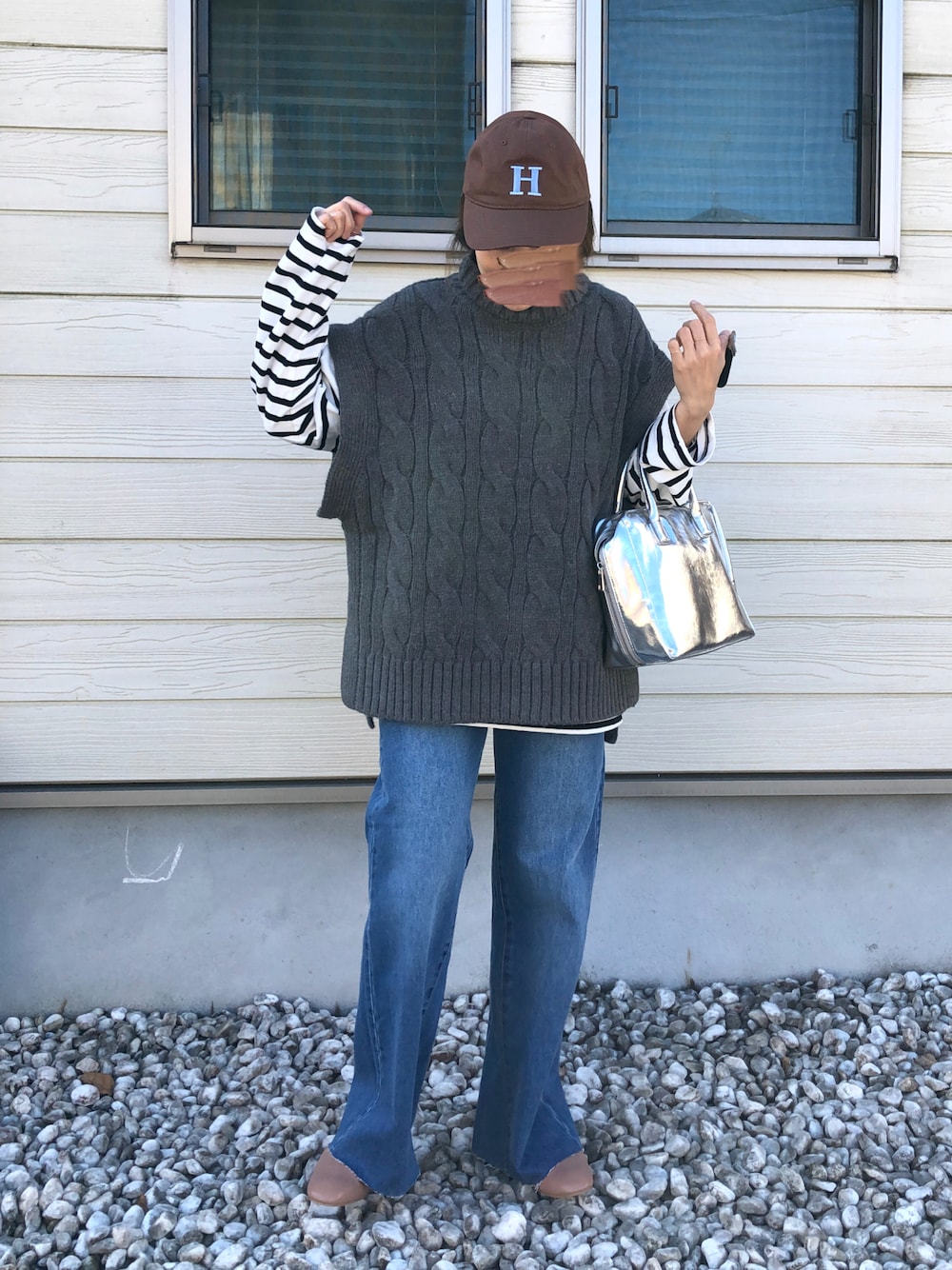 近所への買い出しコーデ! ベストは家事をするのにも邪魔にならないから、本当に優秀✨ このニット、2ウェイだからこれまた優秀! ありがた〜い♡