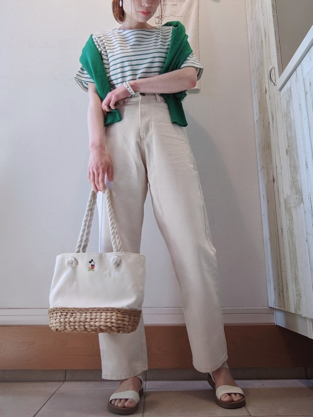 ご覧頂きありがとうございます⋈*.。 初夏の爽やかwhite×greenコーデです🤍💚 今年はグリーンボーダー推し!! HoneysのボーダーT、カラー展開豊富で形も色々あるから、オススメです🙌✨