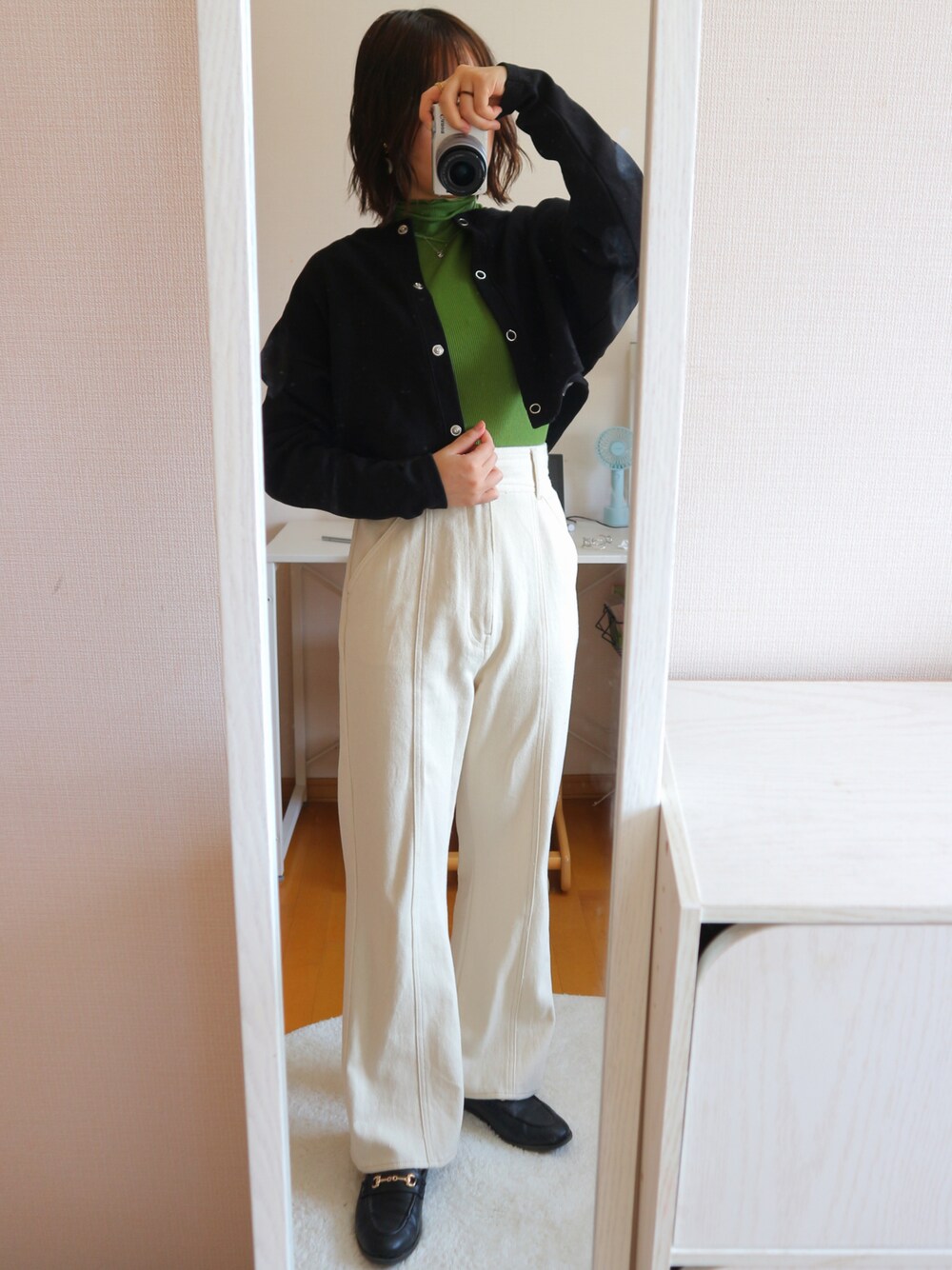 kasutaneのグリーンの服が可愛いすぎる😳 シンプルなコーデの差し色になってオシャレ上級者になれる!𓂃 𓈒𓏸໒꒱ 黒のカーディガンも丈が短いのがまた可愛い!!ハイウエストのズボンと合わせると相性抜群👍❤️