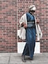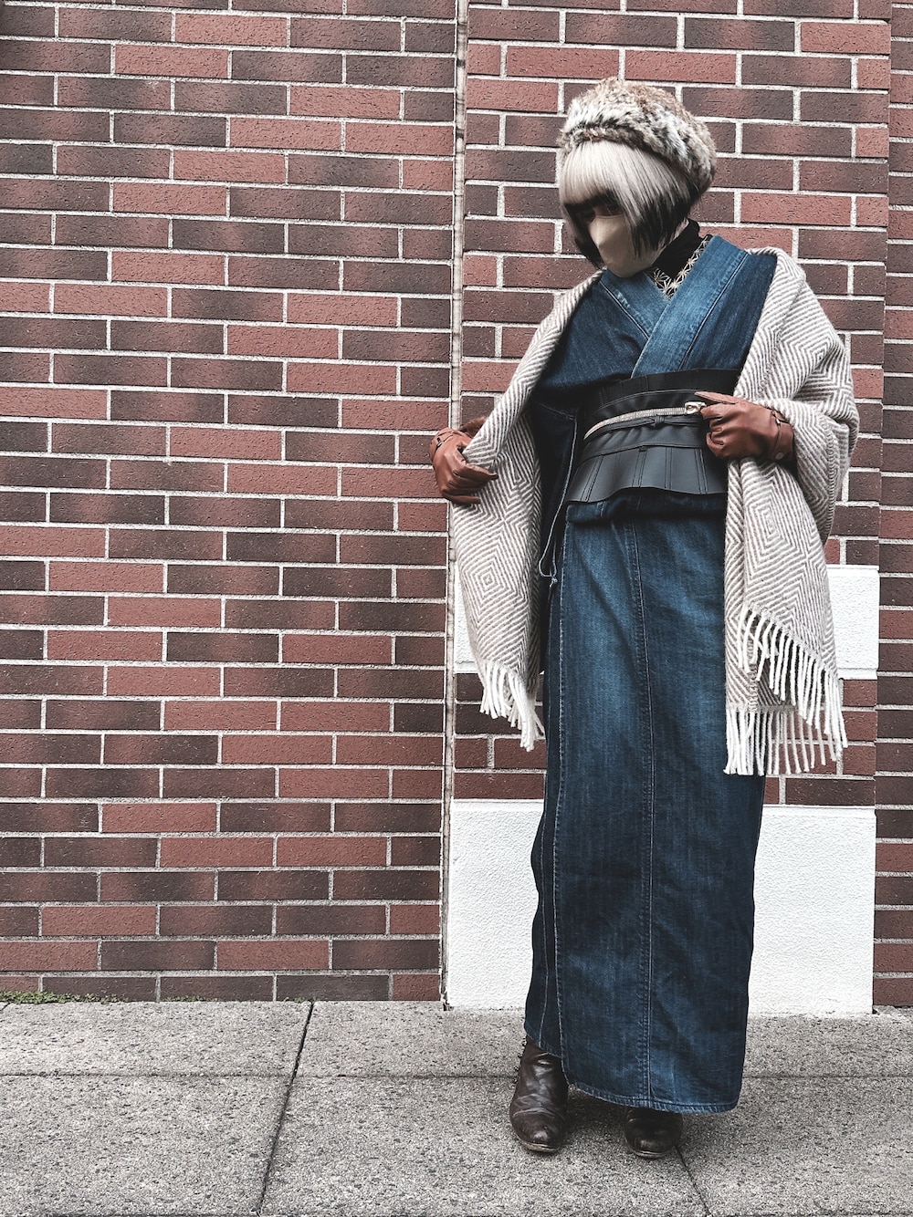着物コーデ デニム着物にMANAのブーツ ファーの帽子で和洋折衷 このショールは着物にも似合って便利❣️