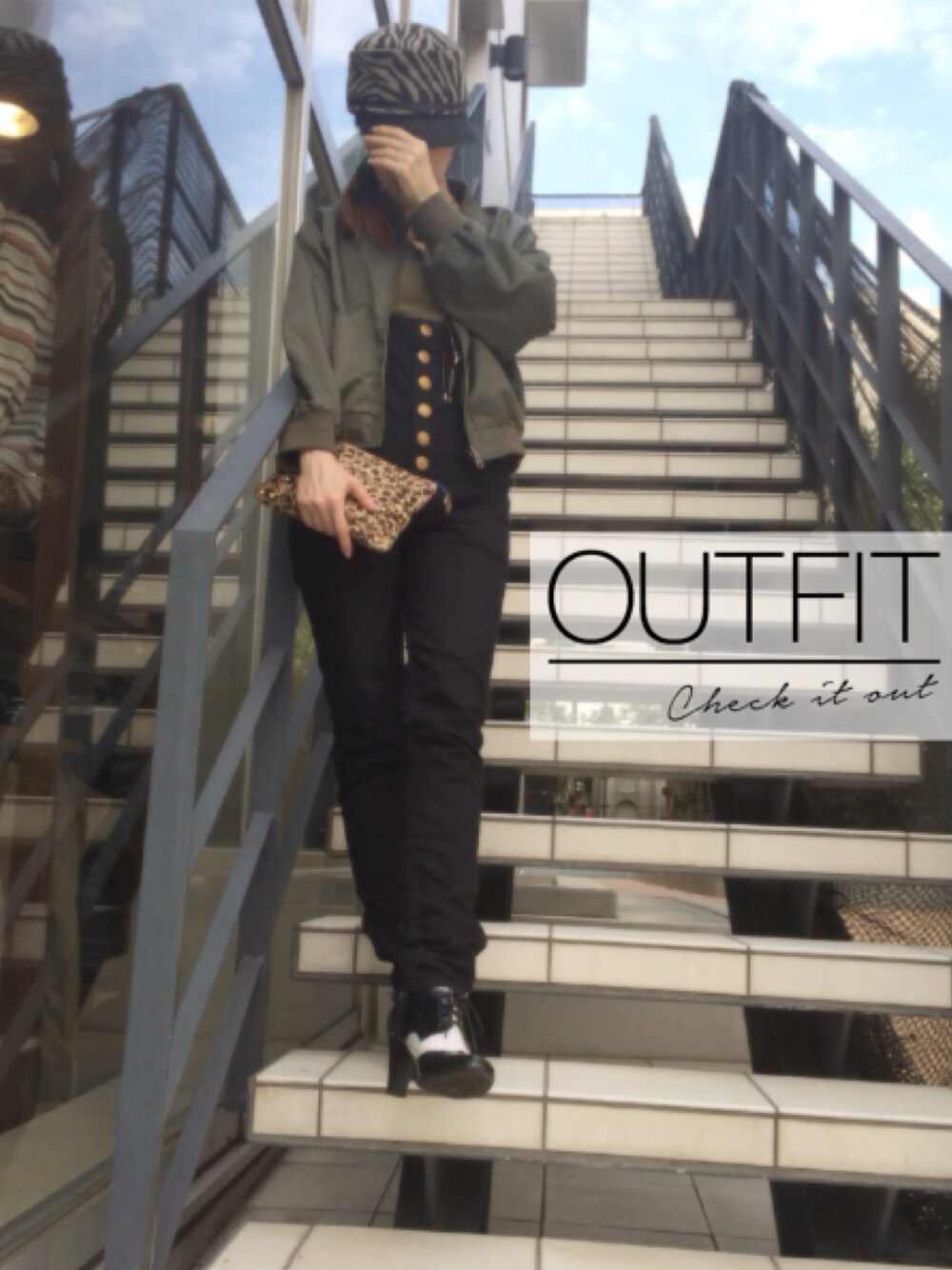Antie Roseのリバーシブル・ブルゾンを羽織って、ロングヘアはフリンジのヘアゴムでまとめてリメイクぼキャップ。 シンプルにカーキの面を合わせました😃