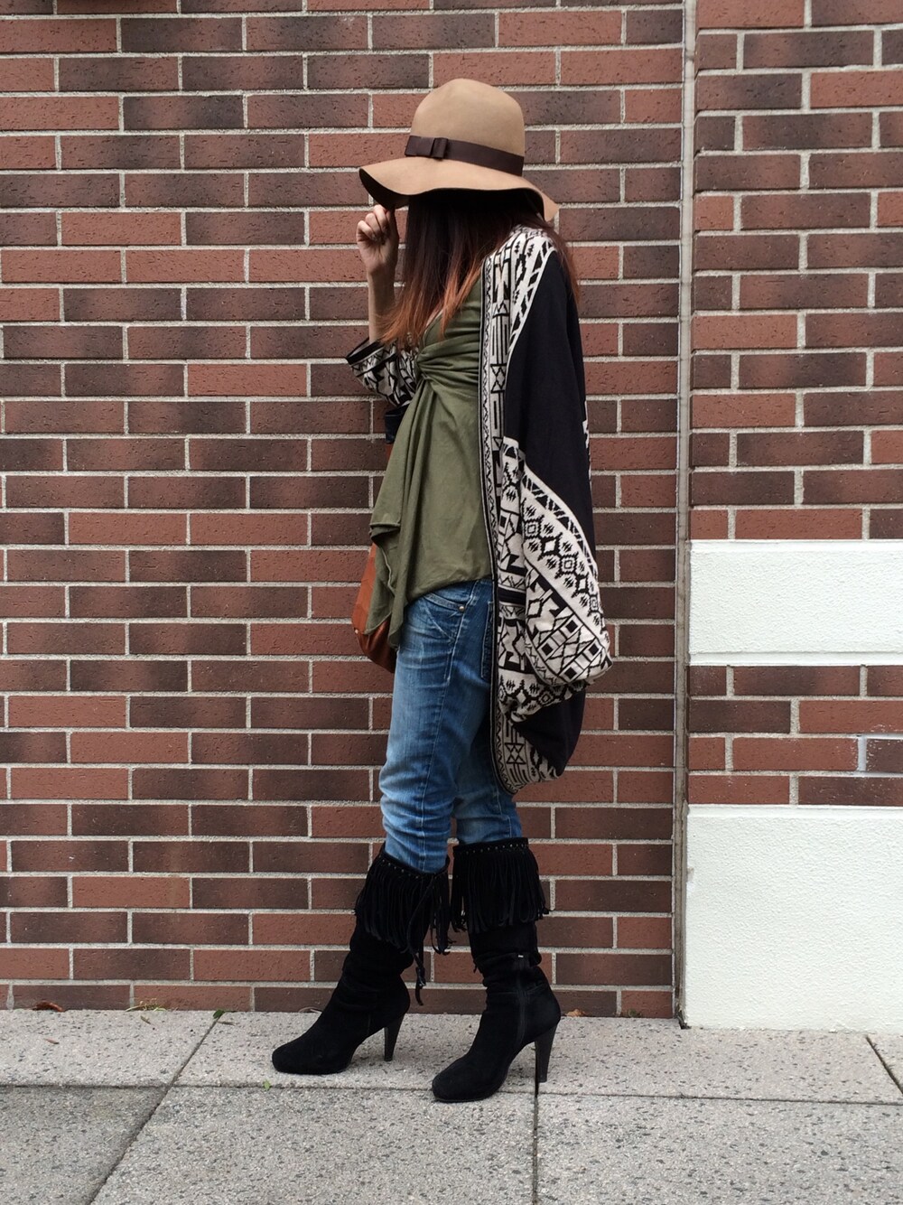 このポンチョヘビロテしてます〜😊 デニムのブーツイン大好き✨ ローズバッドのバッグ、デザインもデカさも気に入ってて、使いすぎてハラコ部分が剥げてきた〜😭 リメイクを考案中。。。