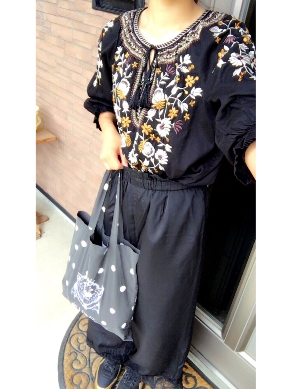 本日のコーデです* いつもいいね、save、コメントいただきありがとうございます😊🙌🙌 ブラックベースでホワイトとゴールドを差し色に😎🌈🌈 トップスはブラウンの10分丈とこのブラックの7分丈の2色持ち♡笑 この刺繍かわいすぎるー( ; ; ) 今日は女子会♬