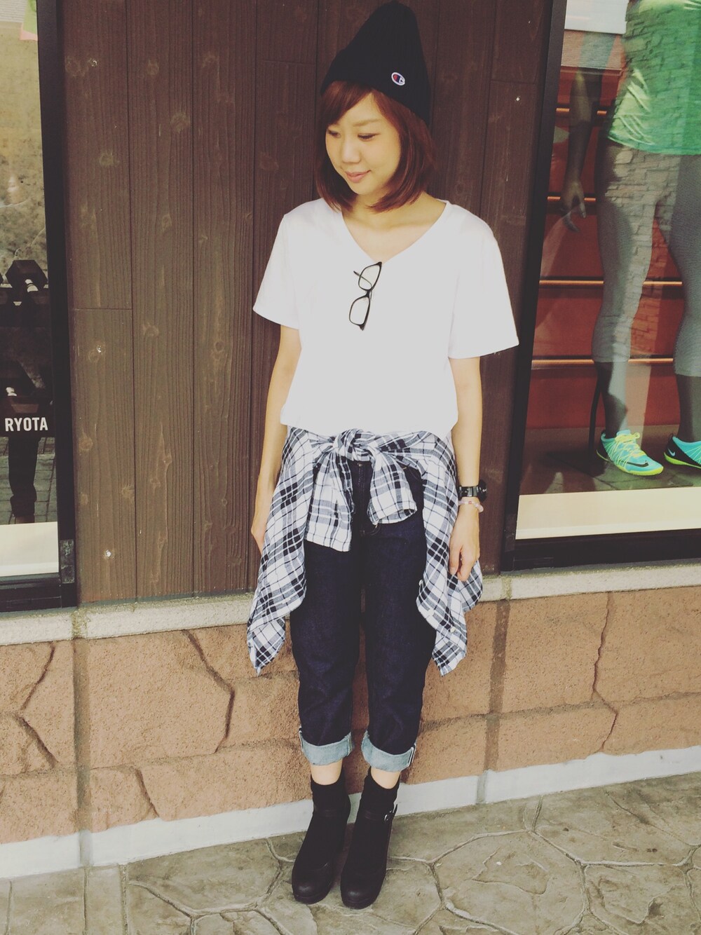 ストレートのアンクルデニムでシンプルコーデ。夏服と秋服のミックス。