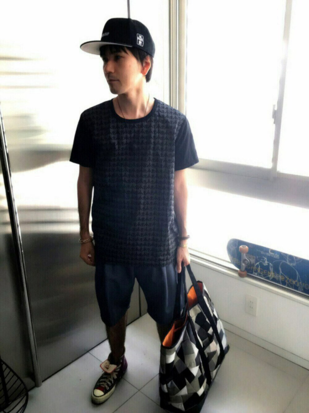 自邸エントランスにて撮影。 太めのショーツにビッグシルエットのTシャツを合わせました。 オーバーサイズではなく、上品なイメージで、クラブやヒップホップを意識してます。 シャドウ期、リフレクト期、ANREALAGEパリコレデビュー以降のアイテム中心です。